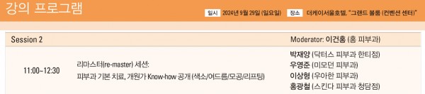 리마스터 세션은 사전에 제가 마스터 선생님들께 기미/여드름/모공흉터/리프팅 등의 4가지 대 주제에 맞게 1주제당 케이스 3개씩 총 12개의 케이스를 미리 나눠드린 후, 각 피부과 의원에 세팅된 장비에 맞게 어떻게 치료를 할 것인지 강의를 한 분당 15분씩 하도록 설정하였습니다.