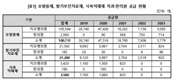 건강보험심사평가원 제출 자료에 따르면 최근 5년간 모발용제 10만 731개, 발기부전치료제 2만 4260개, 식욕억제제 3580개가 치과병·의원과 한의원으로 공급된 것으로 확인됐다.