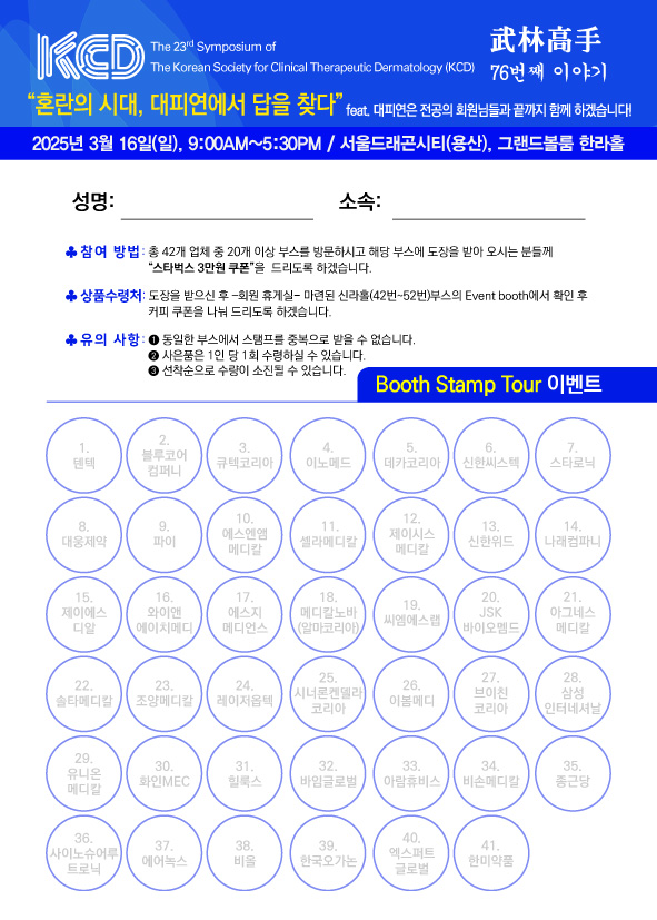 심포지엄 경품 추첨과는 별도로, 행사 당일 접수에서 나눠 드리는 “Booth Stamp Tour” 안내지에 총 42개 업체 중 20개 이상의 부스를 방문하시고 해당 부스에서 도장을 받아 오시는 분들께는 ‘3만원 커피 쿠폰’을 드리도록 하겠습니다.