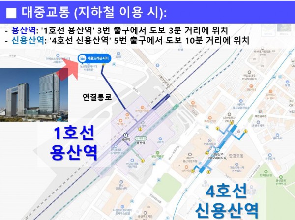 - 1호선 ‘용산역’ 3번 출구 --> 도보 3분 거리에 위치