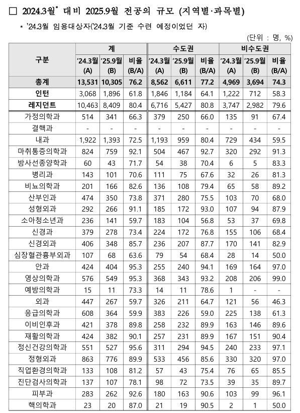 예년 대비 전공의 규모 비율을 연차별로 보면, 인턴 61.8%, 레지던트 80.4%이며, 지역별로는 수도권 수련병원이 77.2%, 비수도권 수련병원이 74.3% 수준을 회복한 것으로 나타났다. 과목별로는 정부의 수련환경 혁신지원 사업 대상인 8개 과목이 예년 대비 70.1%, 그 외 과목은 예년 대비 88.4% 수준으로 나타났다.