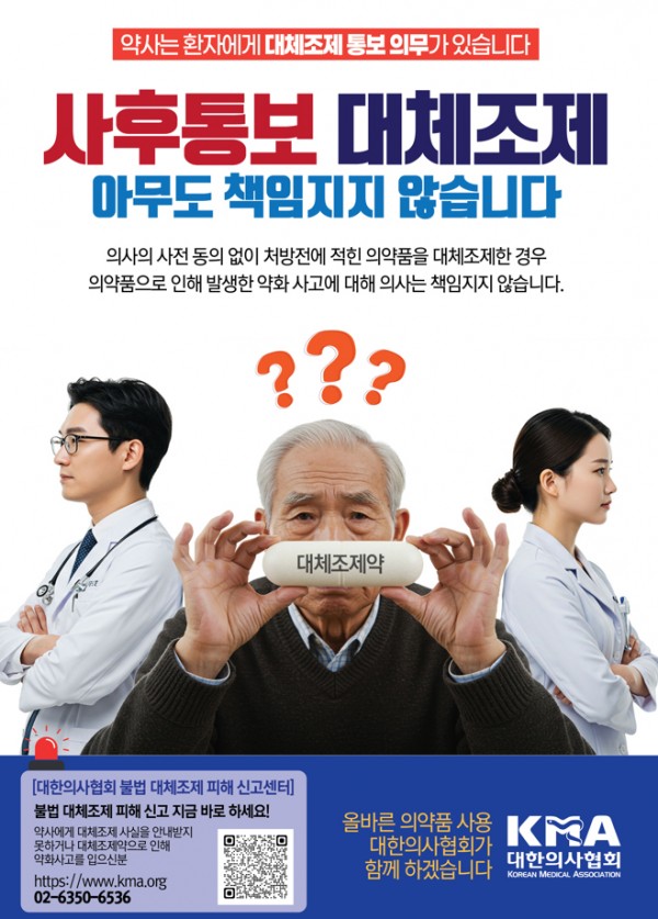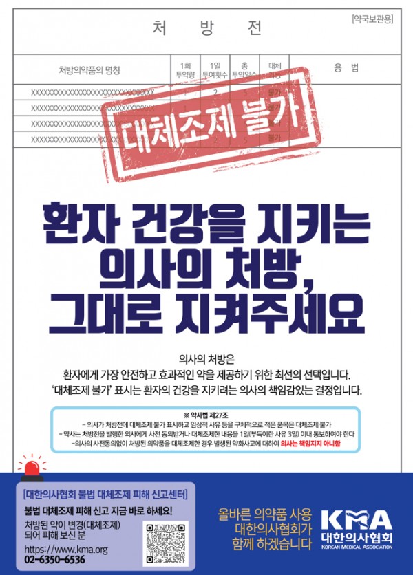 대한의사협회(회장 김택우)는 최근 국회 보건복지위원회를 통과한 약사법 개정안(대체조제 사후 통보방식 변경)과 관련해, 불법 대체조제로 인한 환자 안전 문제에 적극적으로 대응하기 위해 3일 ‘불법대체조제 피해신고센터’를 개소했다.