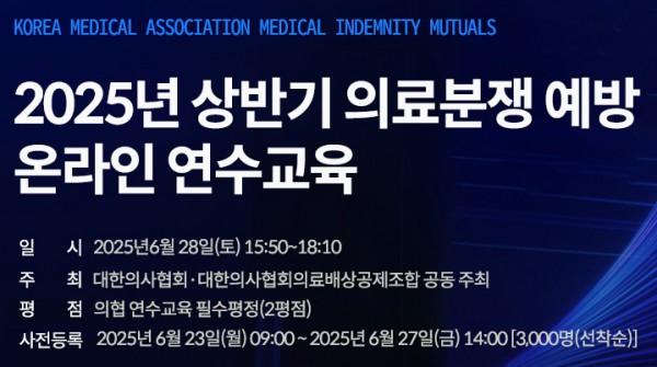 2025년 06월 28일 (토) 15:50 2025년 상반기 의료분쟁 예방 연수교육이 개최됩니다. 2025년 06월 23일(월) 09:00부터 사전등록이 시작될 예정으로 안내차 연락드렸습니다. 조합원분들의 많은 관심과 참여 부탁드립니다.