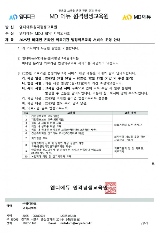 #첨부1. 엠디에듀_지역 의사회 2025년 의료기관 법정의무교육 서비스 제공 안내 2025.06-1부. 끝.