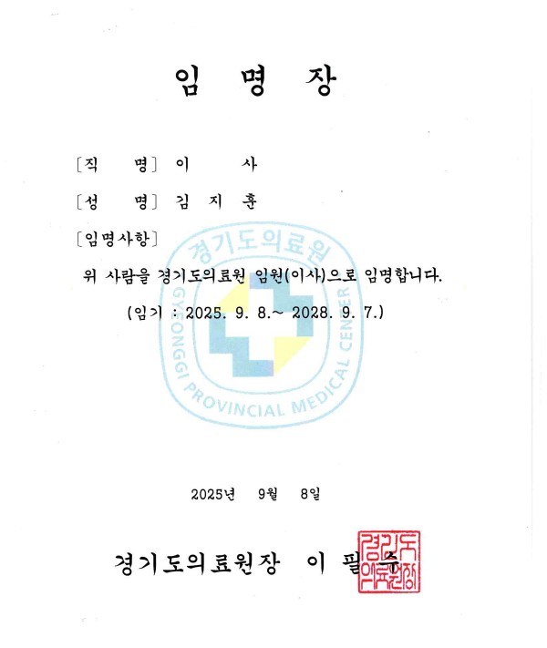 대피연 김지훈 회장이 경기도의료원(원장: 이필수) 이사(비상근)에 위촉되었습니다.