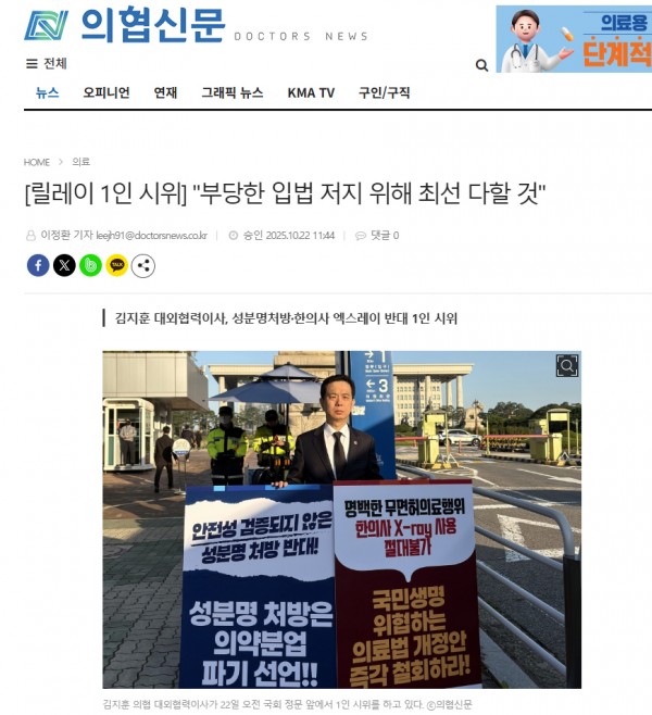 대한의사협회가 수급불안정 의약품에 한정한 성분명 처방 강제화 및 한의사 불법 엑스레이 사용 등 국민건강을 위협하는 의료개악에 맞서기 위해 국회 앞 1인시위를 이어가고 있는 가운데, 22일 아침에는 김지훈 대외협력이사가 시위에 나섰다.