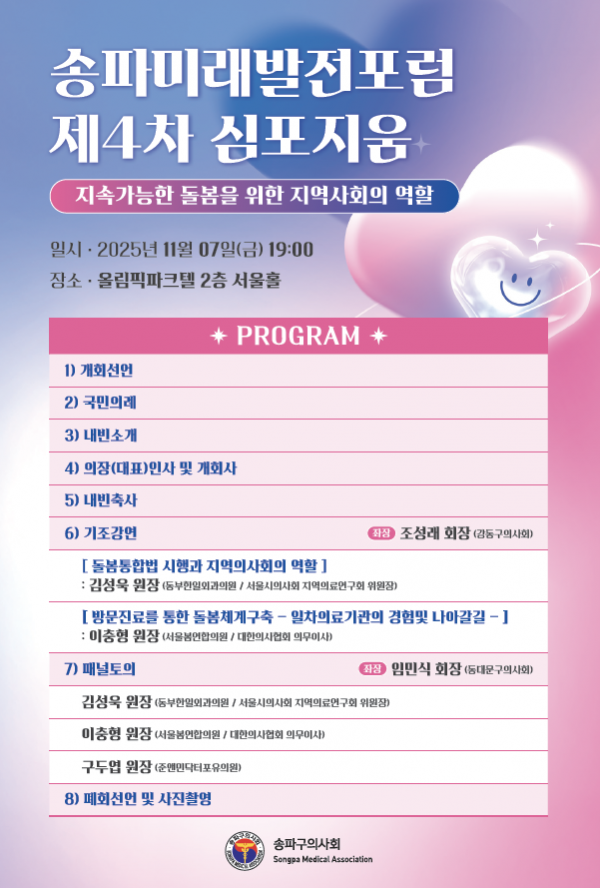 ‘지속가능한 돌봄을 위한 지역사회의 역할’이라는 주제로 개최된 이날 심포지엄에는 ‘민주당 남인순 국회의원(송파병)’, ‘국힘 한지아 국회의원(의사)’, ‘개혁신당 이주영 국회의원(의사)’ 등이 참석하였습니다.