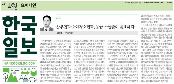 [한국일보]산부인과·소아청소년과, 응급소생술이 시급하다(김지훈, 수원시의사회장)