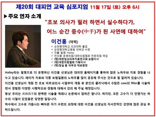 ▷대피연 홈페이지에 좋은 글을 써 주시는 이건홍 선생님께서는 filler 시술의 경험담에 대해서 허심탄회하게 말씀해 주실 예정입니다.