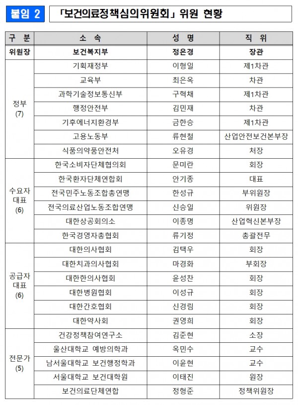 또한, 보건의료정책과의 연관성이 비교적 낮은 정부위원을 축소하여 대표성 문제를 해소하기로 하였다. 대신 축소한 자리를 민간위원으로 전환하여 국민과 의료계 현장의 목소리가 보다 많이 반영될 수 있는 구조를 형성하기로 하였다. 이를 위해 신속하게 보건의료기본법 시행령* 개정을 추진할 것이다.