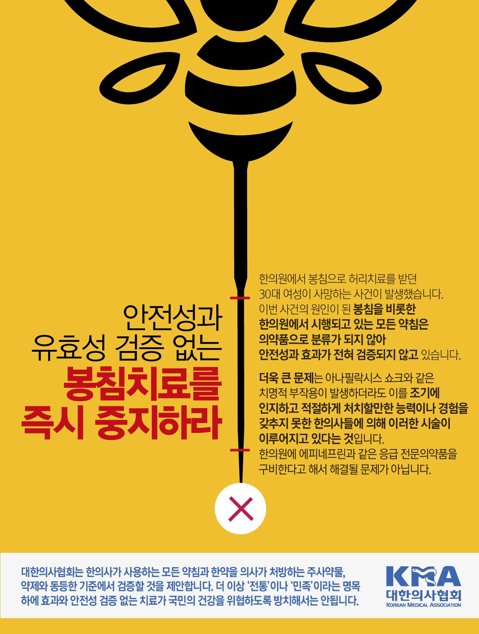 안정성과 유효성 검증 없는 ‘봉침치료를 즉시 중지하라’(KMA)
