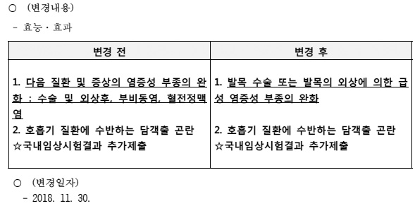 ▷이달 12월 1일 부터는 발목 수술 또는 발목의 외상에 의한 급성 염증성 부종의 완화에만 사용하도록 변경된다. 이에 따라 급여 대상이 되는 염증질환 처방은 발목 부위만 급여가 가능해진다.
