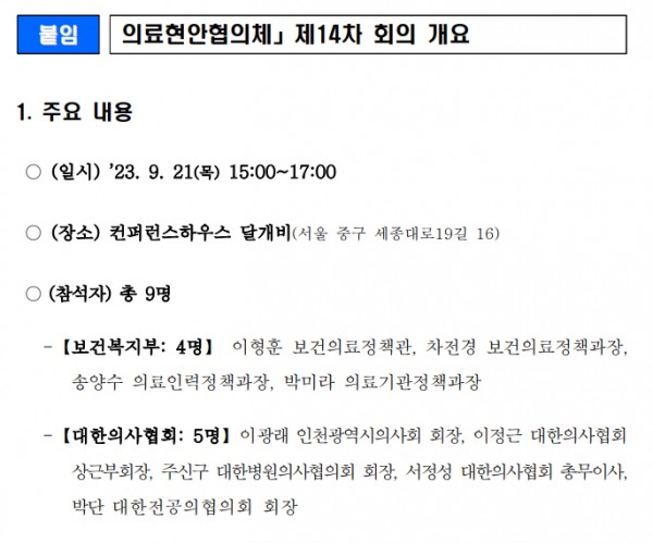 보건복지부(장관: 조규홍)와 대한의사협회(회장: 이필수)는 9월 21일(목) 15시에 컨퍼런스하우스 달개비(서울 중구 소재)에서「의료현안협의체」 제14차 회의를 개최하였다.