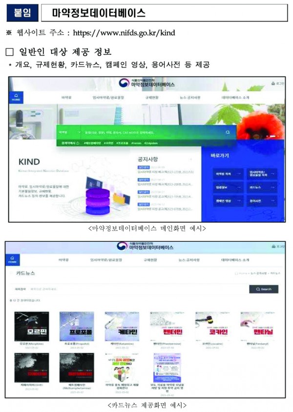 - 마약류 등 정보, 법령, 오남용 예방 카드 뉴스, 캠페인 영상 등 제공