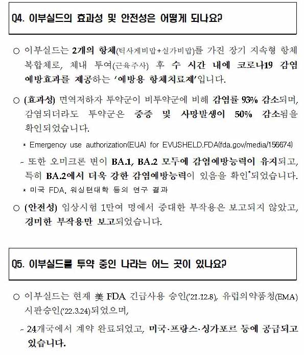 □ 보다 구체적인 신청절차 및 이부실드 투약에 대한 자세한 설명 ‧안내는 6월 말, 의료계, 지자체 대상 설명회 등을 통해 안내할 예정이다.