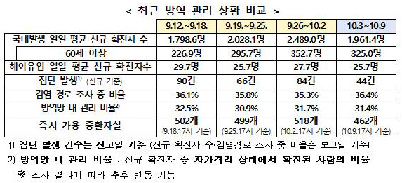 [복지부]주간(10.3.~10.9.) 확진자 수 감소세 전환(하루 평균 1,961, 지난주 대비 21.2% 감소)