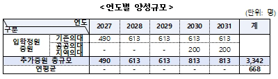 이와 함께 2027년의 경우 기존의대는 증원규모의 80% 규모(490명)를 증원하도록 해서 증원 초기 의대교육 현장의 부담을 완화할 수 있도록 하였다.