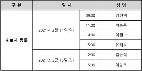 중앙선관위에 따르면 2월 14일에는 ▲오전 9시 임현택 회장(대한소아청소년과의사회) ▲오전 11시 박홍준 회장(서울특별시의사회) ▲오후 2시 이필수 회장(전라남도의사회) ▲오후 3시 유태욱 회장(대한가정의학과의사회)이 후보자 등록을 예고했다.