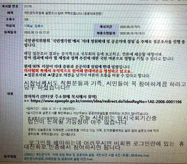 - 의협, "반대여론 잠재우려 관권 동원 개탄... 권익위 설문 중단해야"