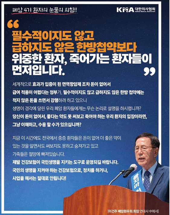 이 회장은 “세계적으로 효과가 입증이 된 면역항암제조차 돈이 없어서 급여 적용이 어렵다는 정부가, 필수적이지도 않고 급하지도 않은 한방 첩약에 대해서는 의사들이 반대하는데도 강행하려 하고 있다. 생명이 경각에 달린 우리 폐암 환자들에게는 무슨 논리로 설명할 것인가”라며 정부에 원성을 쏟아냈다.
