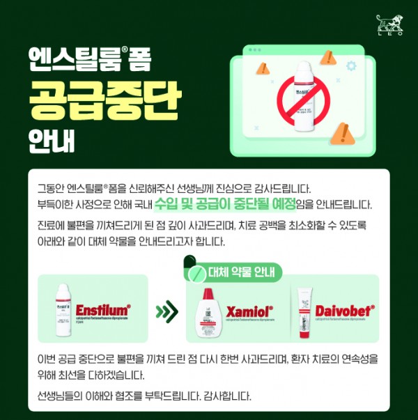 엔스틸룸폼 공급중단 안내 대피연 메일보내기 이름으로 검색 0 374 2026.01.25 09:29 첨부파일 - 첨부파일: 엔스틸룸 공급 중단 안내_HCP1 복사.jpg (838.0K) 0 짧은주소 - 짧은주소: https://laserpro.or.kr:443/bbs/?t=gD9 주소복사 × 짧은 글주소 복사 Note! 위 주소를 드래그, 복사(Ctrl+C)하여 사용하세요. 다음글 목록 본문 ▶엔스틸룸폼 공급중단 안내LEO pharma의 건선치료제 인 엔스틸룸폼이 공급 중단된다고 합니다.진료에 참고 부탁드리며, 다이보베트 및 자미올 겔 처방과 관련해서는 아래 내용 참고 부탁드립니다.[보험]엔스틸룸폼 공급중단 안내 및 다이보베트, 자미올 겔 처방 안내(연령제한, 다이보베트 1주에 100g까지 처방)https://www.laserpro.or.kr:443/bbs/?t=gD8 다음글 목록 댓글목록 등록된 댓글이 없습니다.