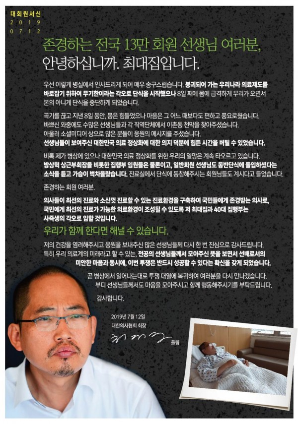 저의 건강을 염려해주시고 응원을 보내주신 많은 선생님들께 다시 한 번 진심으로 감사드립니다. 특히 우리 의료계의 미래라고 할 수 있는, 전공의 선생님들께서 모아주신 뜻을 보면서 선배로서의 미안한 마음과 동시에, 이번 투쟁은 반드시 성공할 수 있다는 확신을 갖게 되었습니다.