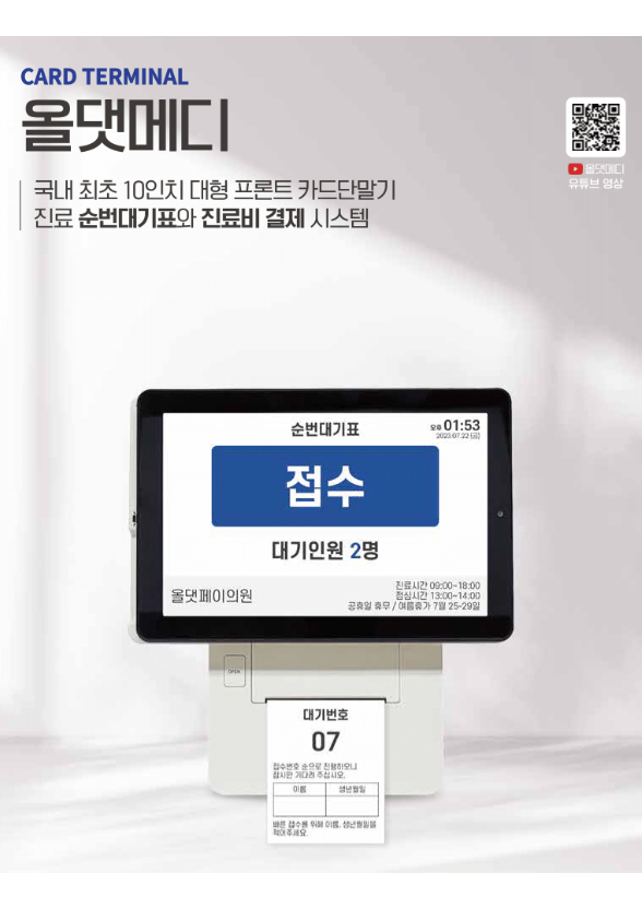 2. ㈜올댓페이는 새로운 결제시스템 시대를 맞아 순번대기번호표 단말기(번호표 출력 가능)/비접촉 결제 기능 환자가 직접 결제할 수 있는 비대면(NFC) 서명패드를 제공해 준다고 합니다.
