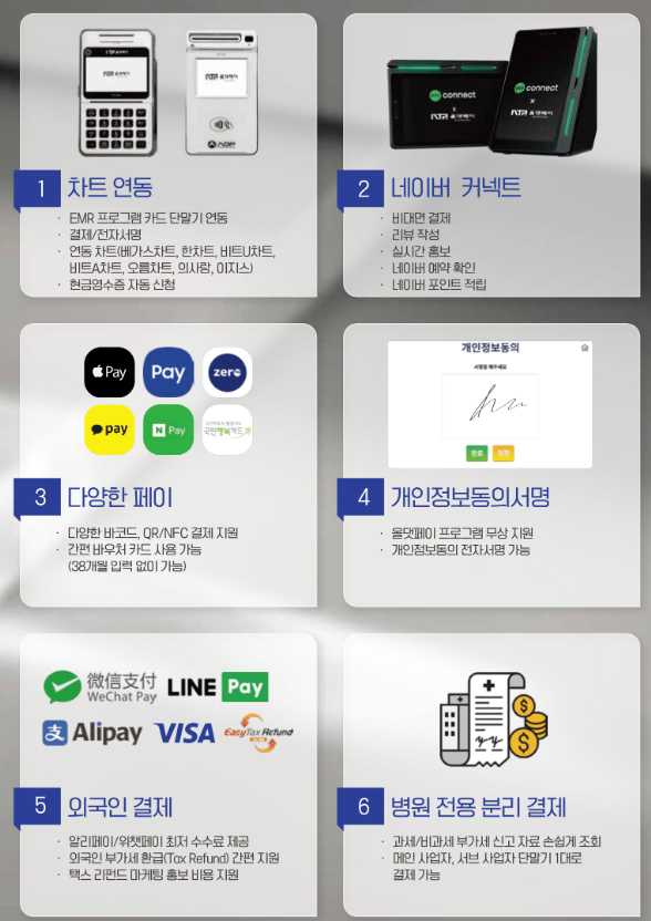 그 외에도 친환경 전표 제공, 최신 양방향 카드 단말기, 차트연동, 환자 예약 스케줄 관리, 개인정보동의 전자서명, 실시간 승인/입금 확인, 다양한 페이 결제 및 이번 출시 예정 네이버커넥트 단말기도 가능하다고 하오니 관심 있는 회원 여러분께서는 올댓페이 업체 측에 문의 해 보시기 바랍니다. (VAN서비스는 여신금융업법 기준으로 서비스를 제공합니다)