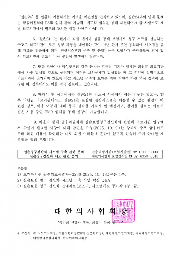 9. 아울러 현재 금융위원회에 실손보험청구전산화와 관련해 의료기관 입장에서 확인이 필요한 사항에 대해 답변을 요청(2025. 10. 2.)한 상태로 추후 금융위로 부터 회신 내용이 확인되는 대로 회원 여러분께 혼란이 없도록 신속히 추가 안내할 계획임을 알려 드립니다.