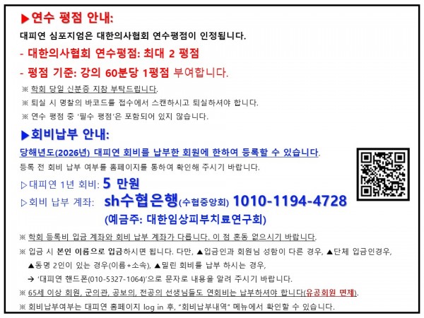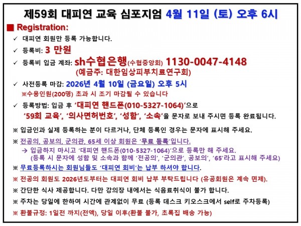 - 회비 납부 계좌: sh수협은행(수협중앙회) 1010-1194-4728 (예금주: 대한임상피부치료연구회)