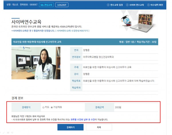 대한의사협회는 KMA 교육센터 내 사이버연수강좌(필수평점) 수강과 관련하여,