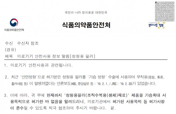 [식약처]성형용 필러를 가슴확대 목적으로 사용 목적 하가한 바 없슴
