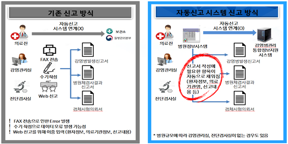 감염병 자동신고 : 법정 감염병 환자 발생정보가 의료정보 시스템에 입력되는 경우 시스템 간 연계를 통해 감염병 발생 신고서(별지 제1호의3서식)를 전송*