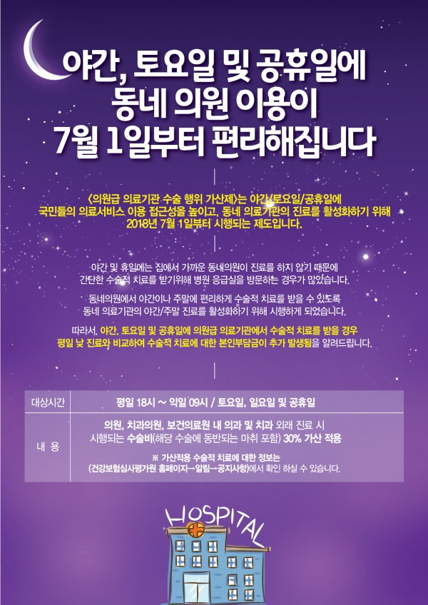 야간(18시~익일 09시), 토요일 및 공휴일에 의원급 의료기관에서 시행하는 간단한 수술적 치료에 대해 ‘2018년 7월 1일’부터 건강보험 수가 30% 가산이 적용됩니다.