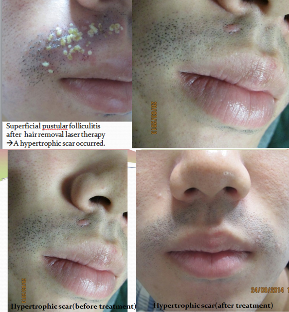 1)코 밑 인중부위에 외상을 받거나, CO2 laser로 점을 제거하거나, 1064nm long-pulsed QSNL 또는 755nm long-pulsed QSAL로 제모를 한 후 skin ulceration이 생기면 인중 부위 상처에서는 대부분 hypertrophic scar가 생긴다. 왜냐하면 인중부위는 woundhealing과정에서 fibroblast의 과다증식이 잘 일어나기 때문이다.