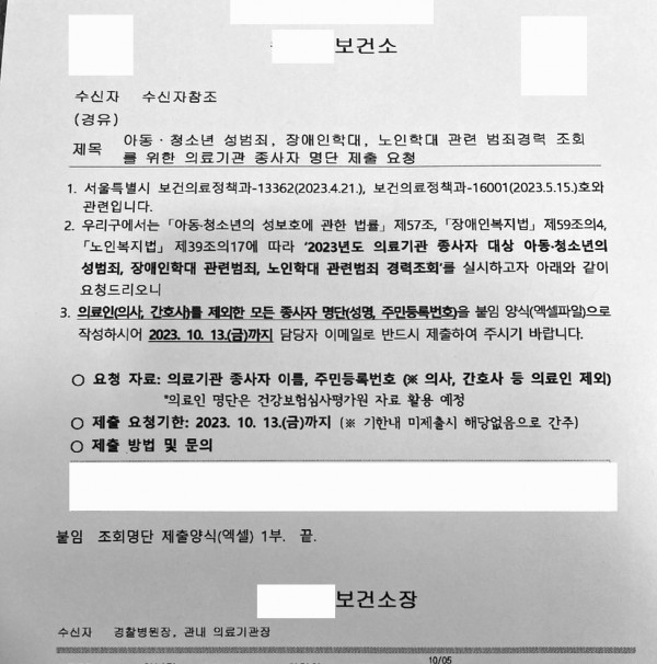 최근 익명게시판 및 대피연119로 보건소에서 범죄정보 확인을 위해 기존 재직중인 직원 주민번호를 보내 달라고 하는 민원이 접수되어 이에 답변을 드립니다.