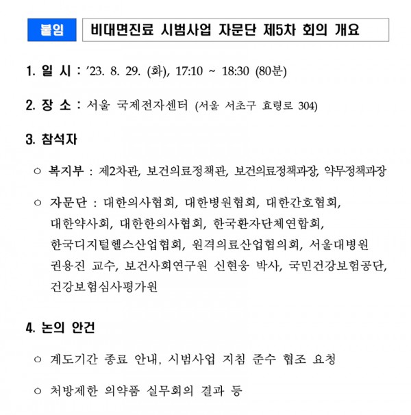 제5차 자문단 회의에서 박민수 보건복지부 제2차관은“비대면진료 시범사업은 감염병 위기 단계 조정에 따른 법적인 공백과 비대면진료 중단 위기에 대응하여 국민의 의료접근성 제고를 위한 조치”로서,