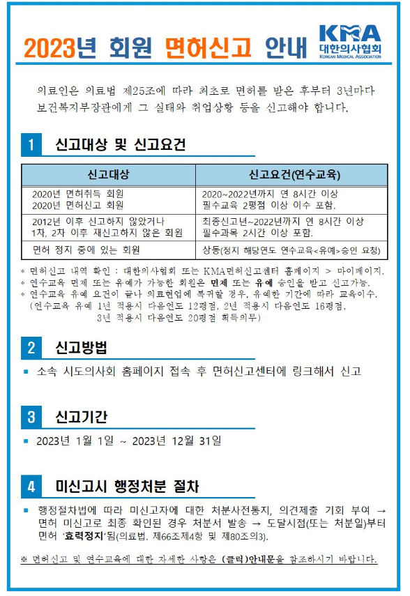 의료인은 의료법 제25조(신고)에 따라 최초로 면허를 받은 후부터 3년마다 보건복지부 장관에게 그 실태(연수교육 이수여부)와 취업상황 등을 신고해야 함.
