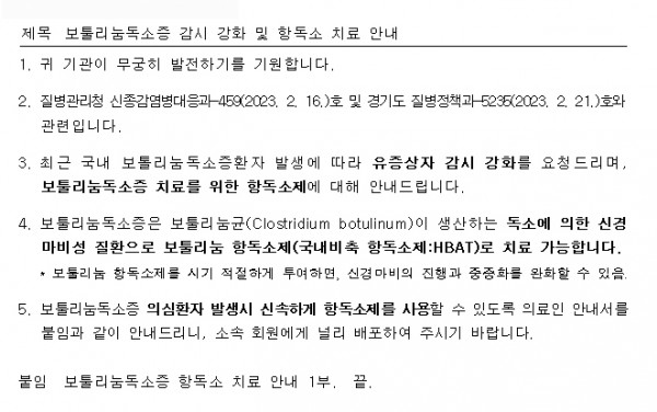 [질병청]보툴리눔 독소증 감시 강화 및 항독소 치료 안내BTX보톡스 대피연 메일보내기 이름으로 검색 0 11,533 2023.02.24 10:49 첨부파일 - 첨부파일: [붙임] 보툴리눔독소증 항독소 치료 안내.hwpx (109.6K) 209 - 첨부파일: 공문.jpg (135.6K) 173 짧은주소 - 짧은주소: https://laserpro.or.kr:443/bbs/?t=bwY 주소복사 × 짧은 글주소 복사 Note! 위 주소를 드래그, 복사(Ctrl+C)하여 사용하세요. 이전글다음글 목록 본문 [질병청]보툴리눔 독소증 감시 강화 및 항독소 치료 안내 이전글다음글 목록 댓글목록 등록된 댓글이 없습니다.