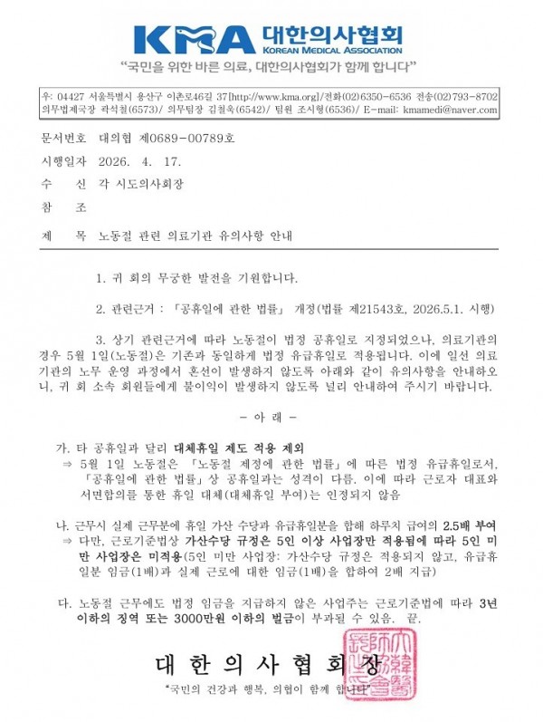 대한의사협회 역시 지난 17일 각 시도의사회장에게 공문을 통해 노동절이 법정 공휴일로 지정된 만큼 법정 유급휴일로 적용되는 점을 상기시켰다. 의료기관의 노무 운영 과정에서 혼선이 발생하지 않도록 당부한 것.