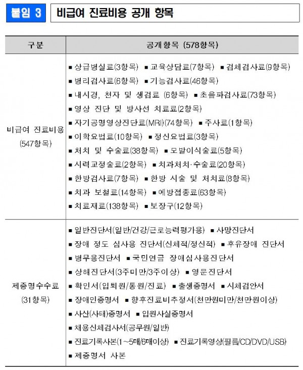 □ 비급여 진료비용 공개제도는 의료기관마다 차이가 있는 비급여 진료 항목의 가격 정보를 공개해 국민의 알 권리를 보장하고 합리적 의료 선택을 지원하기 위한 제도로, 전체 의료기관의 578개(올해 기준)* 비급여 항목을 대상으로 운영하고 있다.