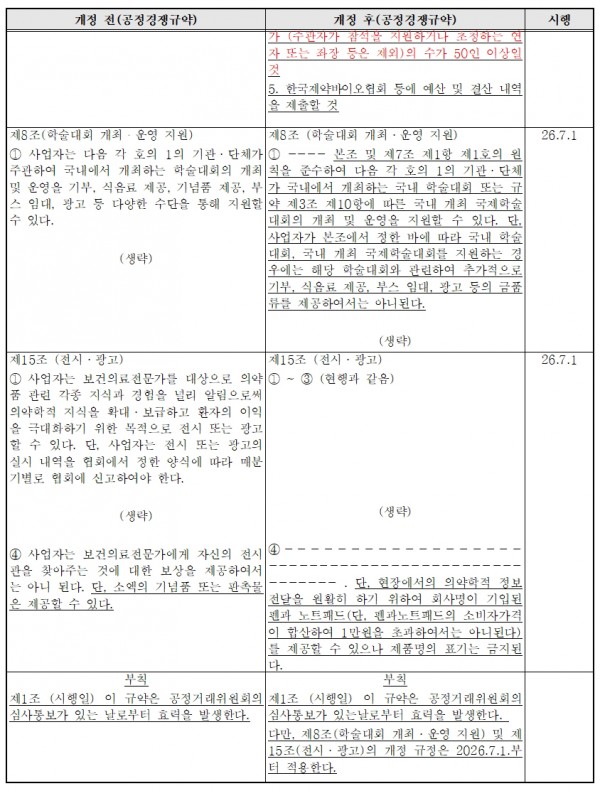 이에 따라 공정위는 공문을 통해 유예기간 동안 학술단체·제약업계가 변경된 기준을 충분히 숙지하고 준비할 수 있도록 안내와 계도 활동이 필요하다는 점도 함께 명시했다.