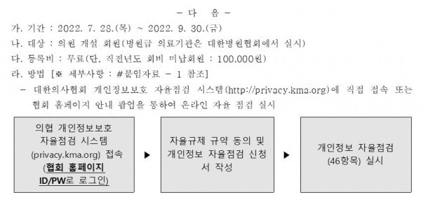 아울러 개인정보보호 자율점검 참여 회원 중 직전년도 의협회비 미납회원을 대상으로 자율점검 등록비를 부과된다고 합니다(직전년도 의협회비 납부 회원은 무료).