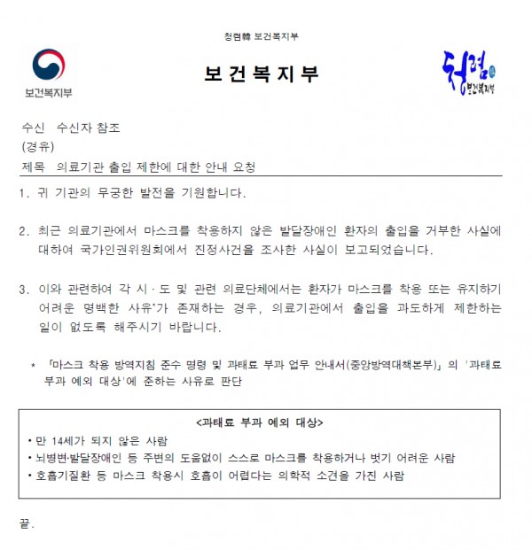 [복지부]마스크 미착용으로 의료기관 출입 제한 예외(14세미만.발달장애인.호흡곤란)