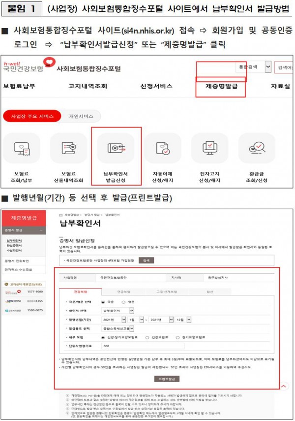 □ 종합소득세 신고용 4대 사회보험료 납부확인서는 “사업장은 사회보험통합징수포털(si4n.nhis.or.kr), 개인은 공단홈페이지(www.nhis.or.kr)에서 확인과 발급이 가능”하며,