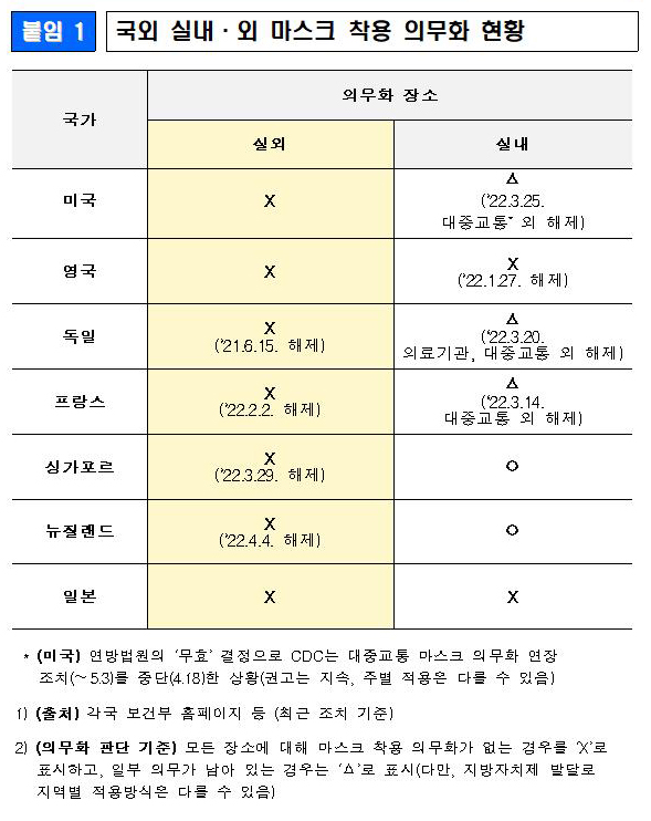 ○ 정부는 감염 위험이 높은 실내에서는 마스크 착용이 매우 중요하다고 설명하면서, 이번 실외 마스크 착용 의무 완화와 관계없이 실내 마스크 착용 의무는 철저히 준수하는 것이 필요함을 강조하는 한편,