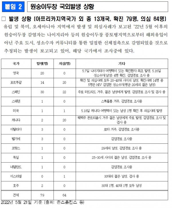 □ 질병관리청(청장 백경란)은 최근 유럽과 북미에서 이례적으로 원숭이 두창환자가 발생하고 있는 상황으로  국내 발생에 대비, 검사체계를 구축 완료하였다고 밝혔다