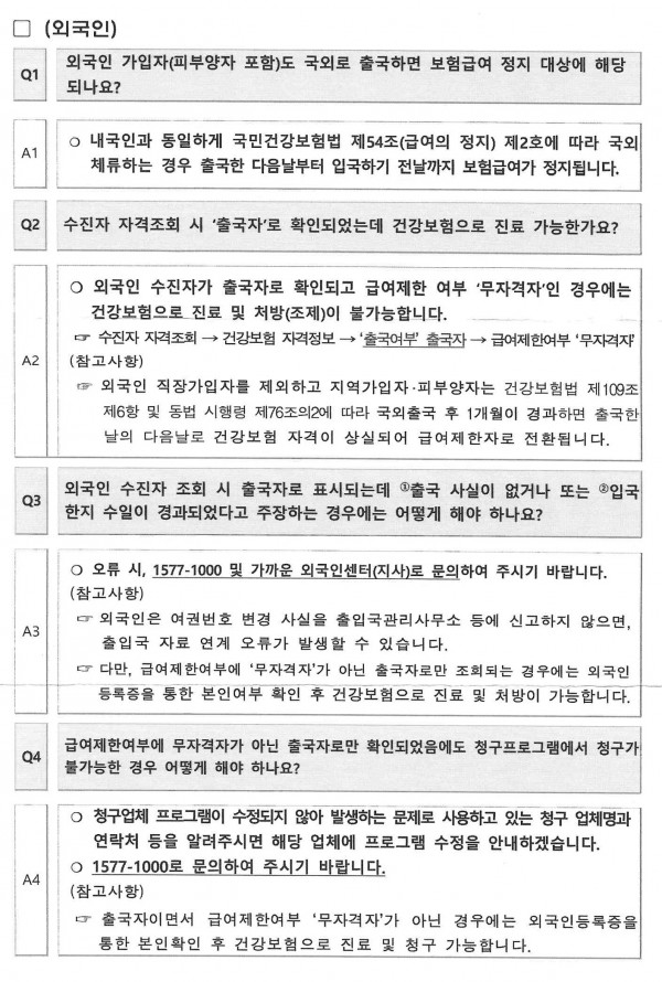 - 외국인 건강보험 가입자(피부양자 포함)가 해외 출국일의 다음날부터 수진자 자격조회