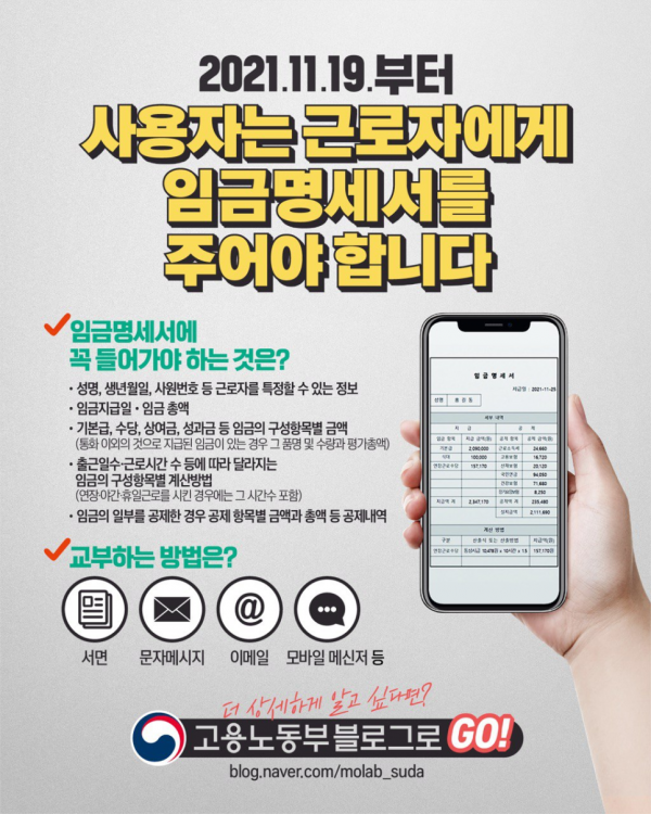 2021년 11월 19일부터 임금명세서 교부가 의무화 되어 있습니다.