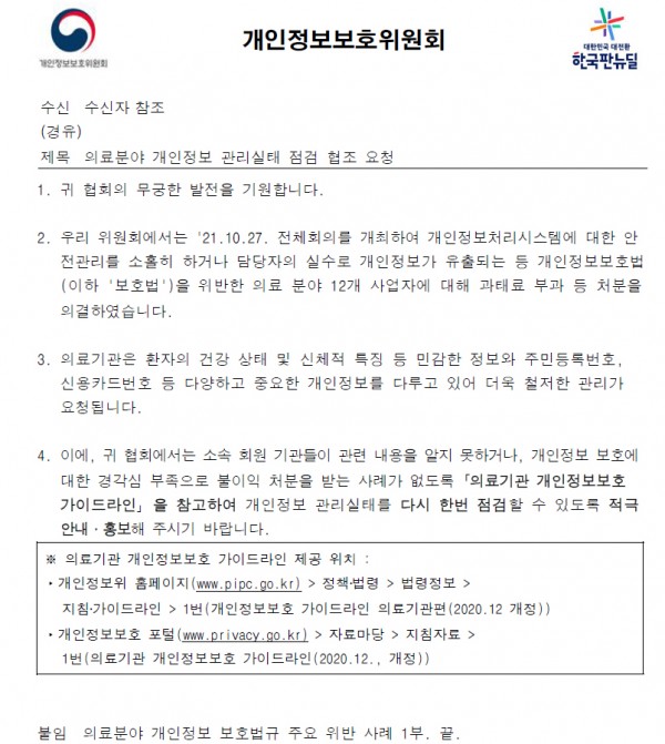 3. 상기 호로 개인정보보호위원회로부터 민감하고 중요한 개인정보를 다루는 의료기관의 철저한 개인정보 관리를 위해 개인정보 관리 실태 점검을 요청해 온 바(붙임),